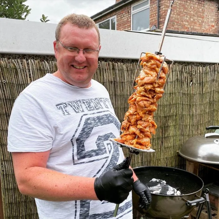 Load up the spit with the marinated meat, pressing down as you go and keeping the build as even as possible. Layer the onions in with the meat too. Get your Weber up to temperature and cook on the rotisserie with the lid on. This gyros was 3.5kg and took just over 1 hour. There were a few straggly bits of onion so these burnt on the outside, but they easily came off and fell into the fire. After carving off some of the meat you can put it back on the rotisserie to crisp up the meat underneath. Look at the joy on my face!