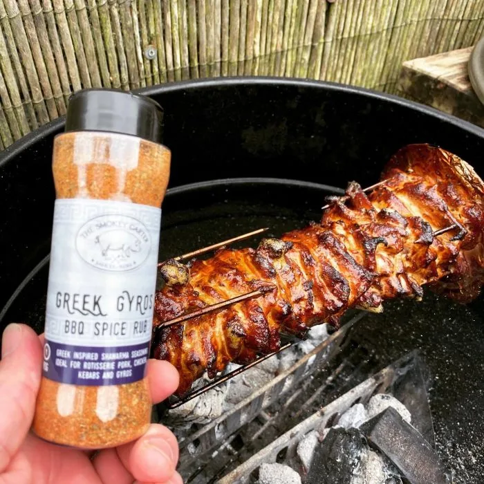 I’v made Gyros a few times on the BBQ. A couple of times it was pre Weber rotisserie so involved manual turning. Thats dedication for you! I’ve also made it just using chicken and another time just using pork. For this recipe I brought the two together which I think complimented to the texture and flavour of the end result. The meat was marinaded with our brand new Greek Gyros BBQ Rub.