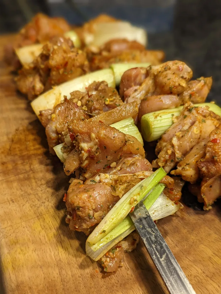 9. Thread the Chicken and Spring Onion onto your skewers.