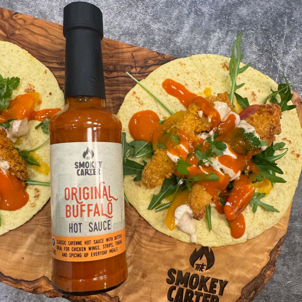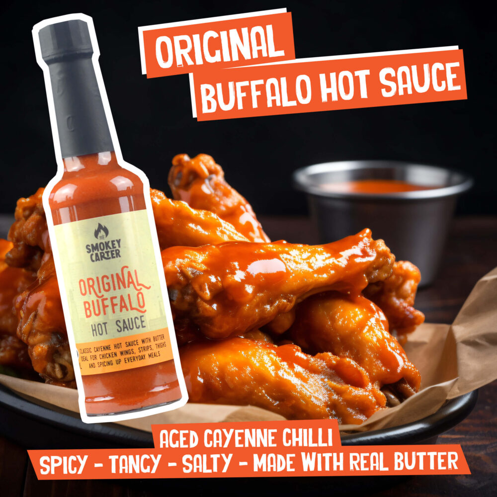 Classic buffalo hot sauce made with aged cayenne pepper and real butter. Tangy, sharp and smooth with a little cayenne chilli kick. The perfect condiment to chicken.